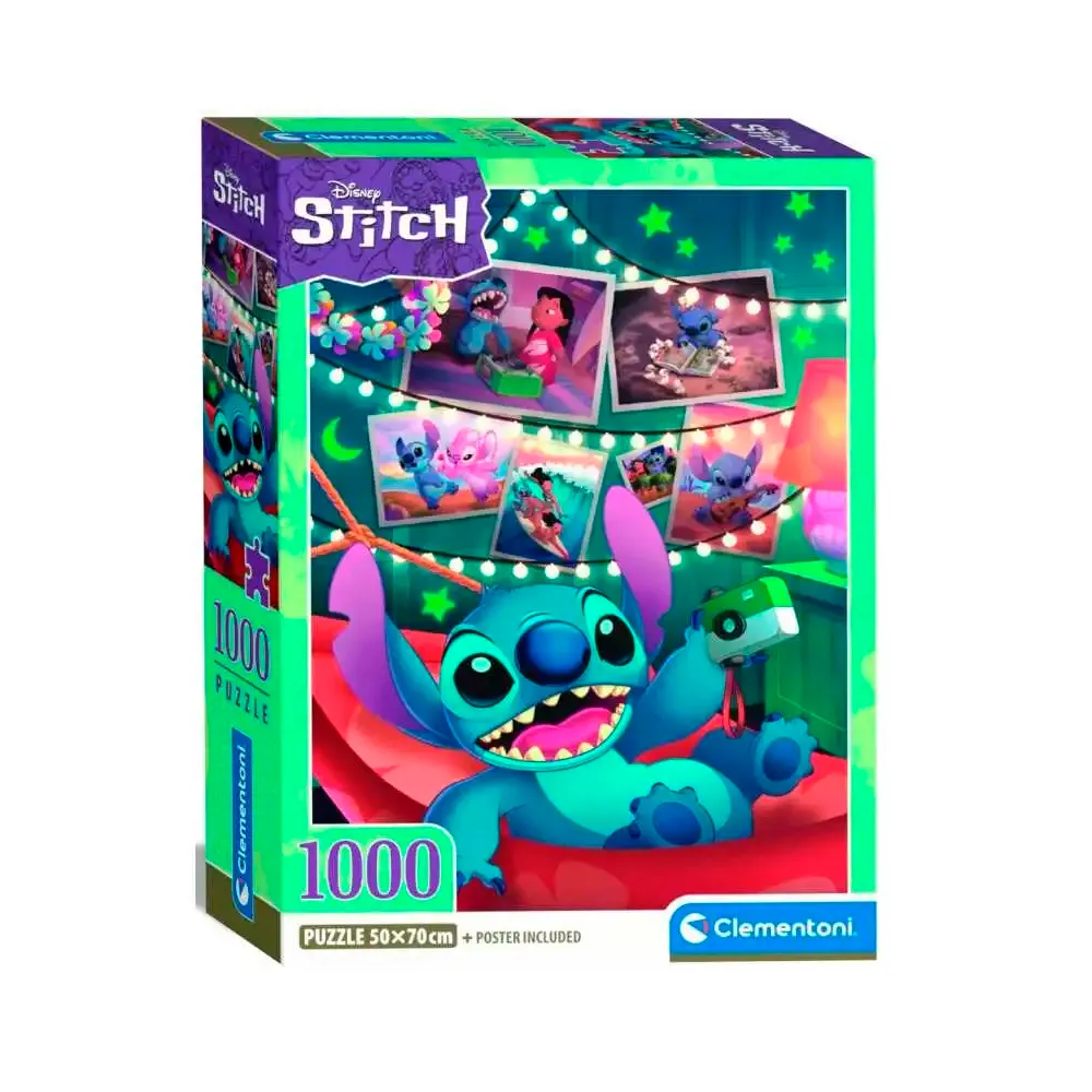 Puzzle de la marca Clementoni de 1000 piezas con imagen de Stich, de la película de Disney, Lilo&Stich. El pequeño alienígena parece descansar en su hamaca y observa las fotografías con bonitos recuerdos.