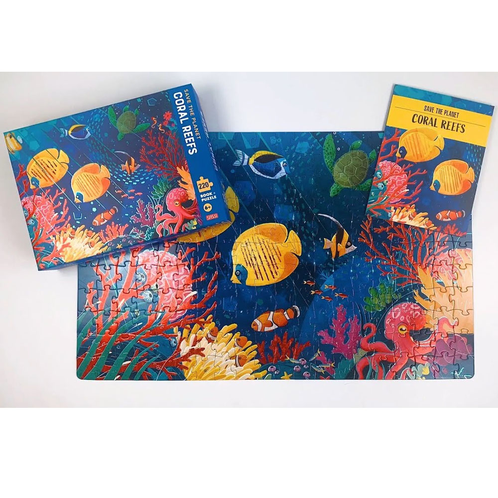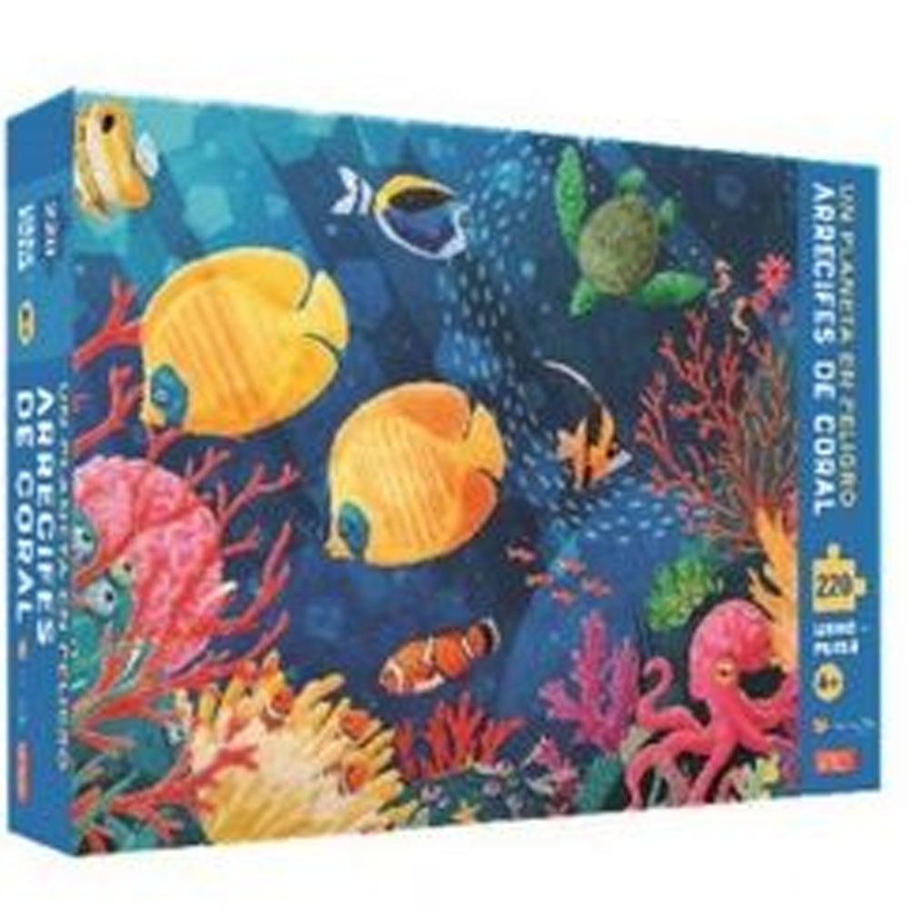 Los arrecifes de coral son ecosistemas increíbles y espectaculares, los cuales se pueden encontrar en lugares donde las aguas son claras, bien iluminadas y con una temperatura entre 20 y 30 grados. Son organismos vivos que tardan miles de años en crecer, que logran alcanzar alturas y longitudes realmente inimaginables y que albergan una fauna verdaderamente variada. Debido a las amenazas naturales, pero sobre todo debido a las acciones humanas imprudentes, estos hábitats extremadamente delicados están en peligro de desaparecer. Un puzle de 220 piezas y un libro de 32 páginas para descubrir todos los secretos del arrecife de coral, que ayudarán al niño a comprender cuánto está en peligro este ecosistema y la importancia de su supervivencia para salvaguardar muchas especies de seres vivos acuáticos.