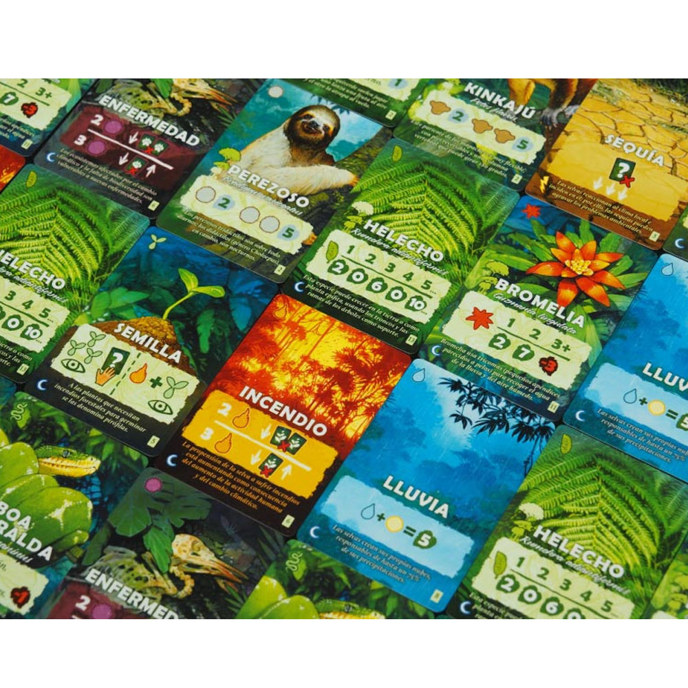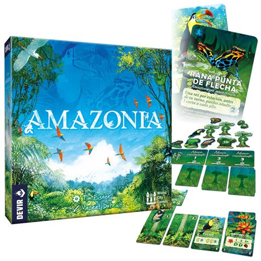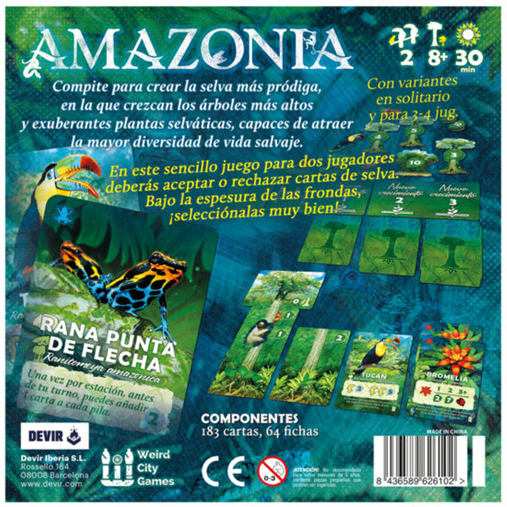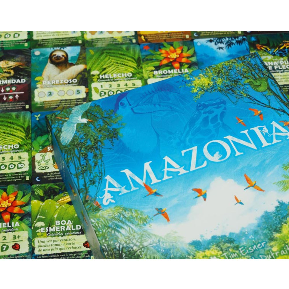 Amazonia es un juego de cartas para entre 1 y 4 jugadores, a partir de 8 años. Con mecánicas de draft y colección, en Amazonia los jugadores compiten para crear la selva tropical más abundante a lo largo de 3 rondas. El ecosistema de la jungla está repleto de relaciones simbióticas entre la flora y la fauna, por lo que los jugadores deberán hacer crecer los árboles, plantar vegetación exuberante y atraer a los animales más diversos y exóticos para lograr la puntuación más alta. Pero cuidado, pues en el mazo también se encuentran peligros como el fuego, las enfermedades o la sequía.