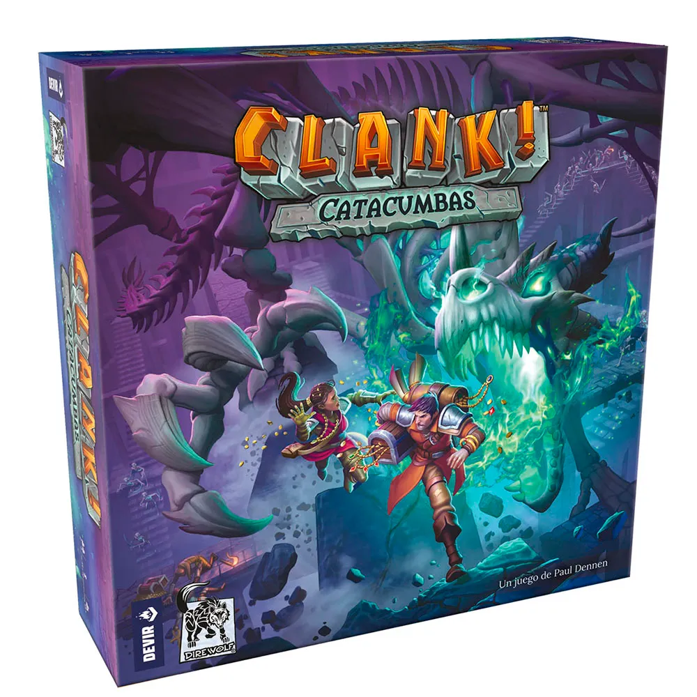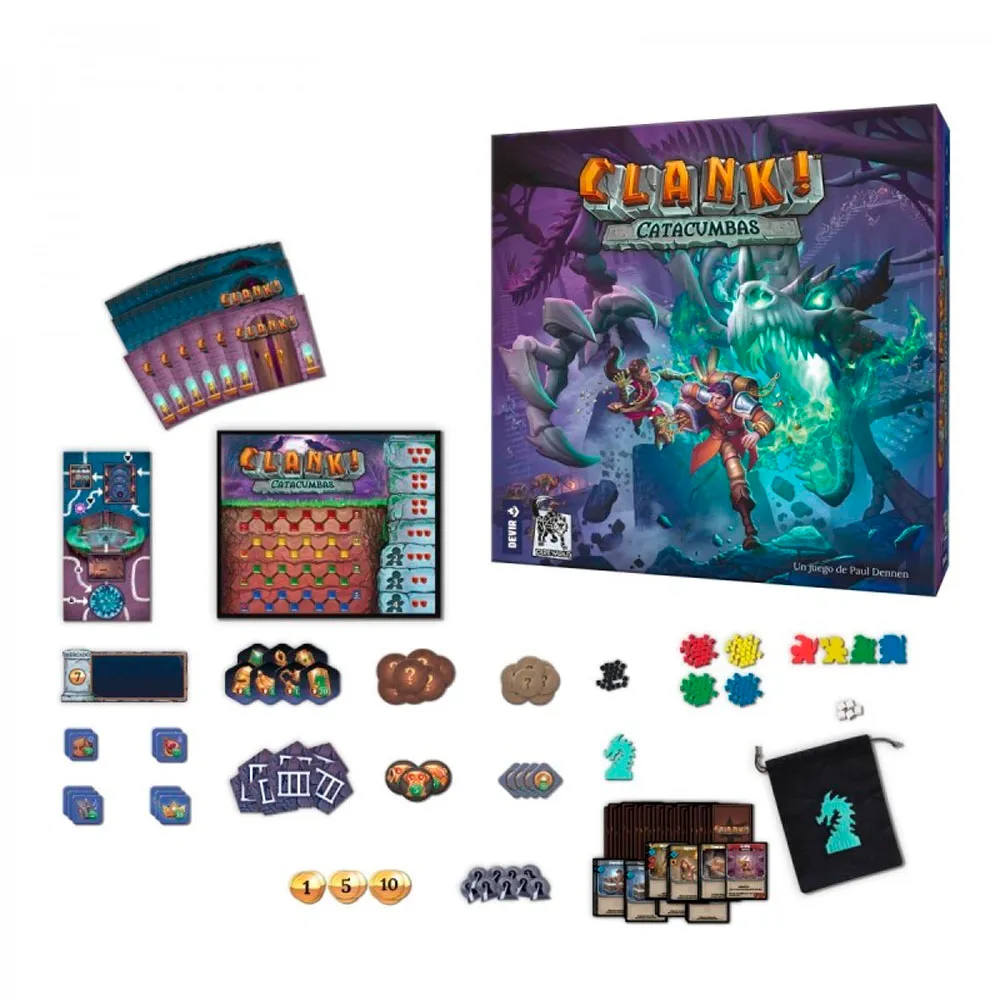 Clank! Catacumbas es un título totalmente independiente pero compatible con otros juegos de la familia Clank!. Obra de Paul Dennen (autor de los otros títulos de la saga Clank! y de juegazos como Dune Imperium), se puede disfrutar en pareja o en grupos de hasta 4 jugadores, a partir de 13 años, en partidas de unos 70 minutos de duración. Con mecánicas de construcción de mazos, colocación de losetas o tentar a la suerte, el juego nos reta a conseguir puntos recogiendo artefactos y valiosos tesoros en lo más profundo de las catacumbas y salir con vida de ellas.