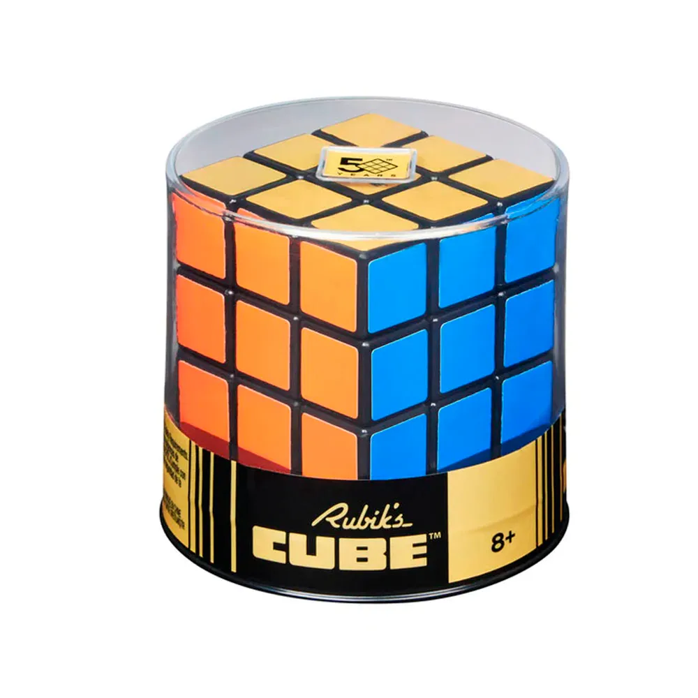 Hazte amante de lo retro con un cubo de Rubik que parece un juguete sacado del pasado con bordes afilados, una rotación más lenta, calcomanías, una cara dorada y un logotipo conmemorativo especial. El cubo se presenta en un estuche de exhibición de plástico de estilo retro.