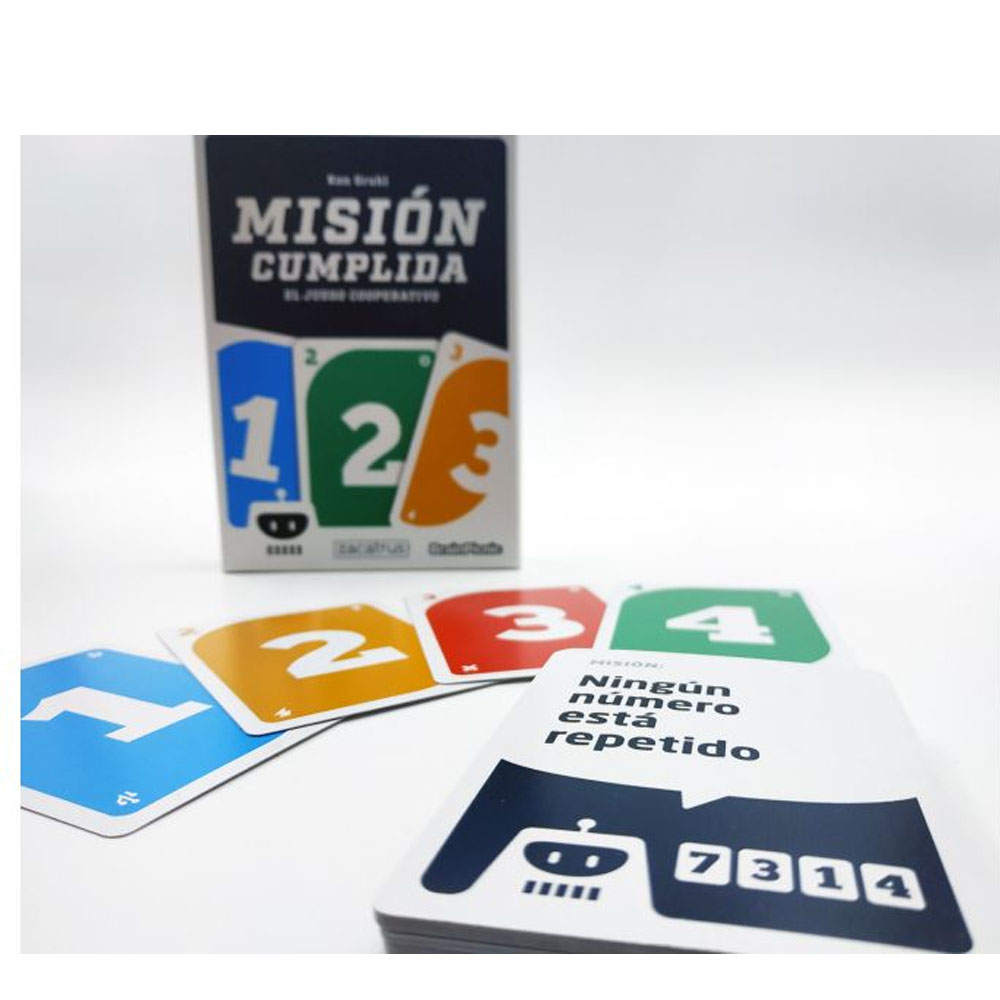 Misión Cumplida es un juego de cartas cooperativo en el que deberéis trabajar en equipo para cumplir el mayor número posible de retos. Juego muy divertido, familiar y para todas las edades. Empezad jugando al modo principiante y… seguro que llegáis pronto a superar el modo experto y ¡locura!