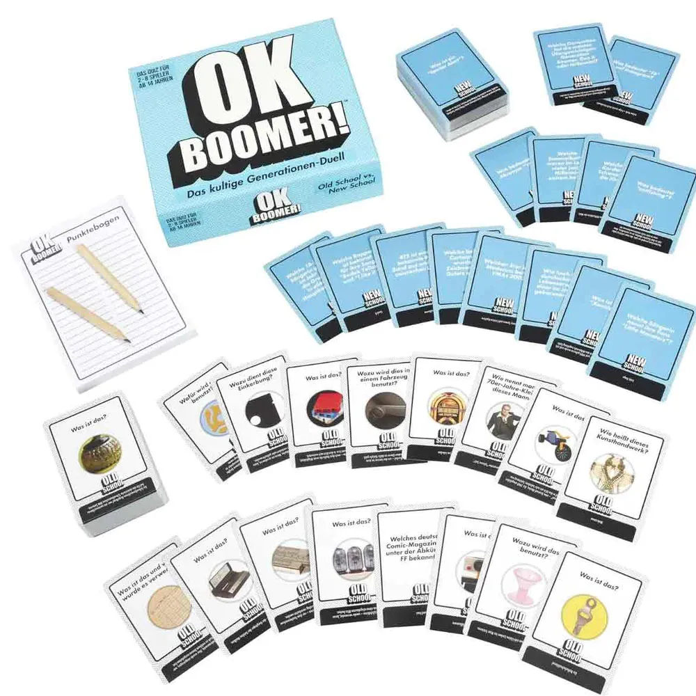 «Ok Boomer» es un emocionante juego de trivia intergeneracional en el que los jóvenes desafían a los expertos de la vieja escuela. Puedes poner a prueba tu conocimiento sobre la cultura popular de diferentes generaciones mientras te unes en equipos o compites por tu cuenta si tienes compañeros de edad similar. Con 220 cartas que contienen una variedad de preguntas, «Ok Boomer» te permite disfrutar de horas de diversión y competición. ¡Reúne a tu familia y amigos para jugar una y otra vez!