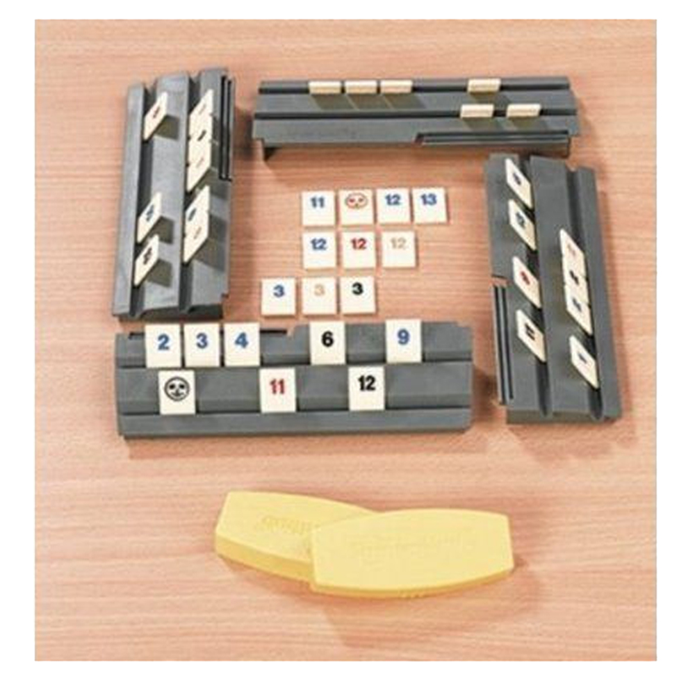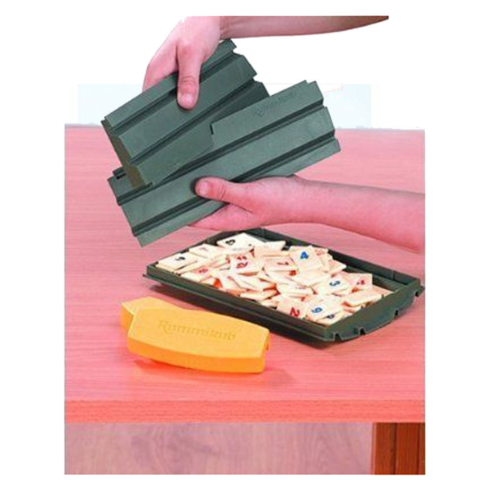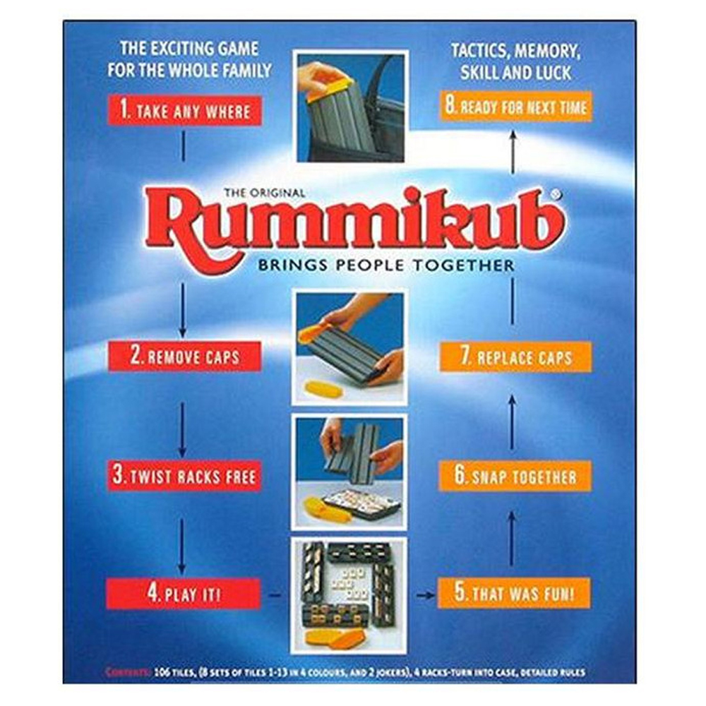 La versión portátil del juego Rummikub. Tiene fichas más pequeñas y se acomoda en un practico estuche que al desarmarse conforma 4 racks (uno para cada jugador).